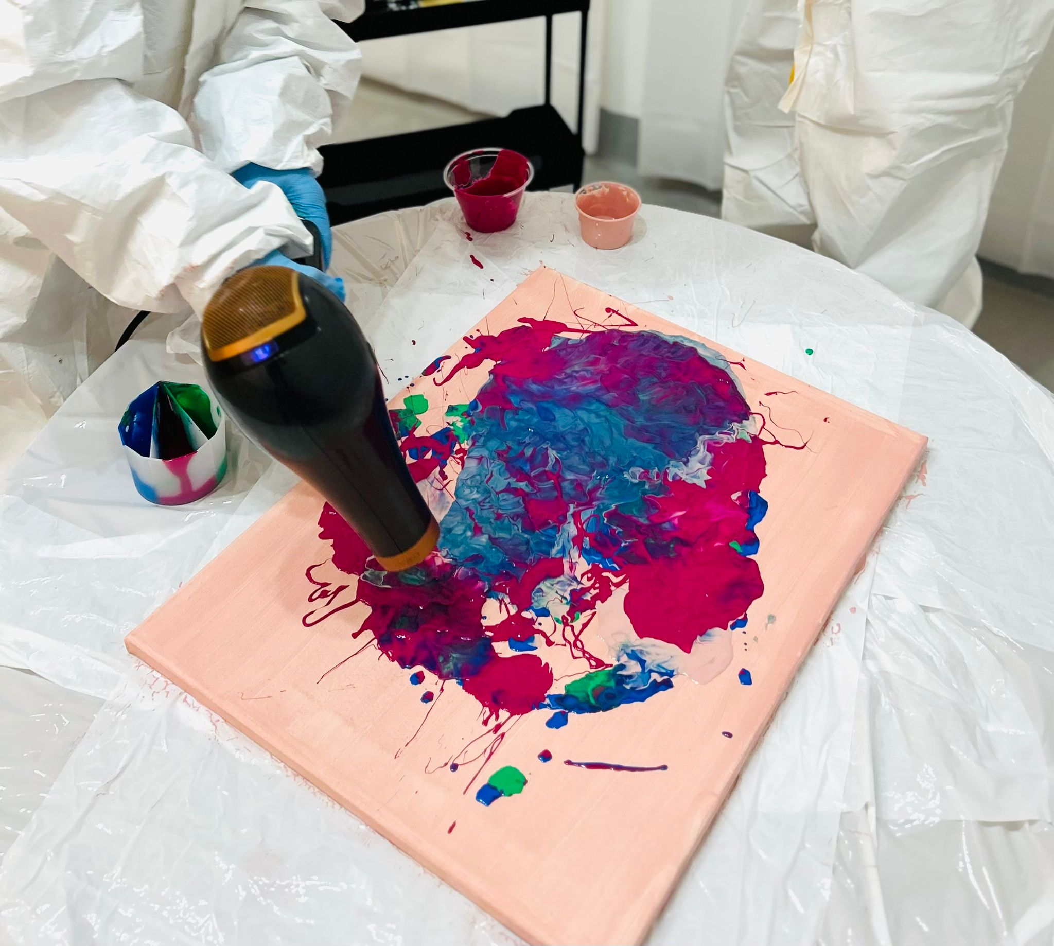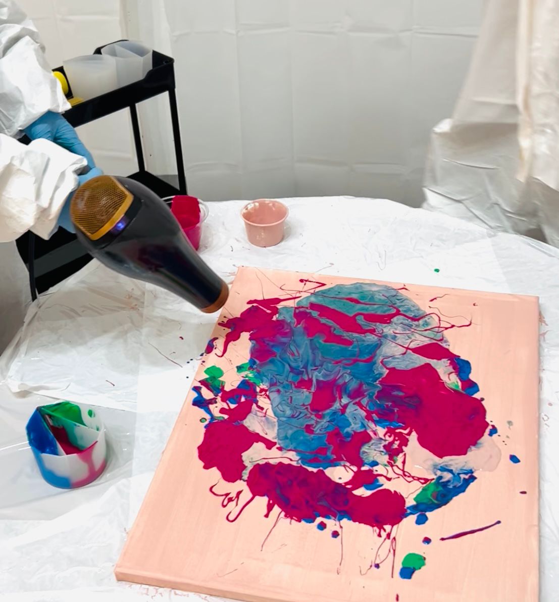 Tekuté barvy volně proudí po plátně a vytvářejí organické přechody a jedinečné abstraktní vzory.