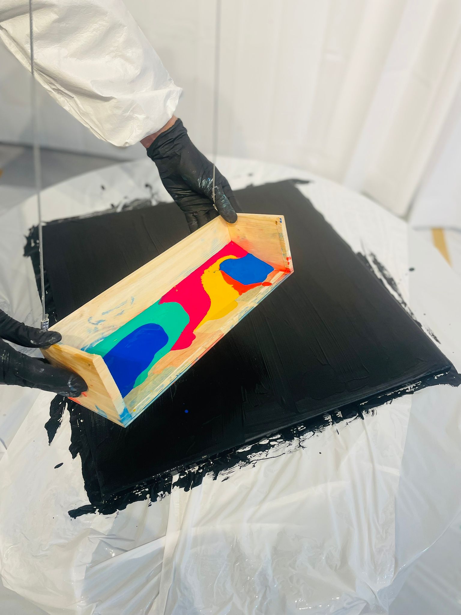 Rotující plátno a odstředivá síla vytvoří dynamickou explozi barev.